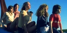 Make no mistake, this is not a “good” movie by any means; but, it is kinda fun. Ellen is fierce and I love that. After all, this poor woman has been through so much. The filmmakers are clearly proceeding as if Jaws 3-D never happened, and thank God for that. Michael Caine comes on board as Hoagie, a foot-loose and fancy-free pilot who romances Ellen. The story of a family vendetta between the Brody tribe and the great white sharks is silly, this we know. The whole movie has this forced sentimentality vibe. I think they were trying to make audiences nostalgic for the original movie and how much they loved it when they first saw it. In the interest of completing the saga, and rooting for mama Brody, give it at least one viewing. In closing, please enjoy this image, from the film, of a woman being eaten alive whilst on a banana boat.